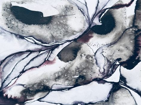 An exploration of form emerging from formlessness. These ink pieces are made through the Taoist principle of wu wei—doing through not-doing. Each mark arises in relationship with water, paper, gravity, and time. Petals decay mid-stroke. Pools bloom, dry, vanish. Trust is central: in the medium, in the gesture, in the moment before the brush meets the surface. What remains is the trace of stillness in motion, of offering without striving.